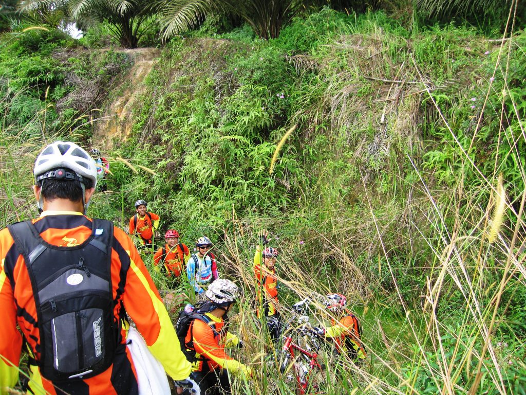 Parit gajah, yang berada di tepi perkebunan kelapa sawit, yang berupa lobang dengan kedalaman sekitar 3 meter dan lebar sekitar 5 meter, yang berfungsi sebagai penghalang bagi gajah agar tidak masuk ke kebon kelapa sawit. Dan kami harus menyeberangi parit ini bersama-sama. Rombongan kami beruntung karena ada sekitar 10 orang berada di dalam satu kelompok yang sama saat memasuki parit Gajah ini, sehingga bisa saling tolong menolong, estafet menyeberangkan sepeda dan menyeberangkan diri. Untuk menurunkan sepeda ke dalam parit diperlukan 4 orang, begitu juga untuk menaikkan sepeda dari bawah parit ke seberang, ada 4 orang yang estafet mengangkat sepeda.