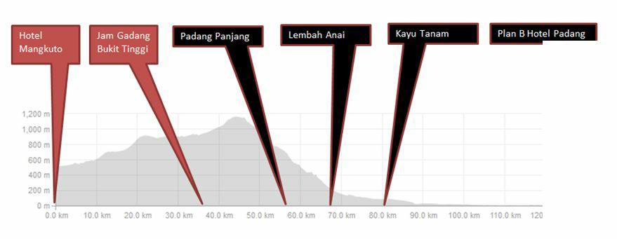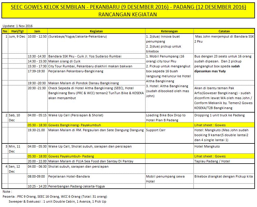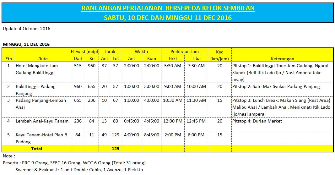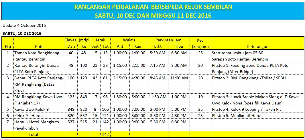 Banyak hal kami diskusikan bersama lewat WAG, setelah sepakat hari, tanggal kegiatan 10 dan 11 Desember 2016, titik awal dan akhir perjalanan dua hari tersebut, dukungan-dukungan logistik dan banyak hal lagi. Mas Dody dan mas Yudy malah detail melakukan kegiatan survey perjalanan, yang membuat perubahan yang cukup signifikan dari rencana awal, dan akhirnya sepakat, kami akan terbang ke Pekanbaru, kemudian jalur gowes kita ini hari pertama Bangkinang-Kelok Sembilan – Payakumbuh, dan hari kedua Payakumbuh-Bukit Tinggi – Padang Panjang – Lembah Anai – Padang dan akan kembali terbang ke Yogya dari Padang.