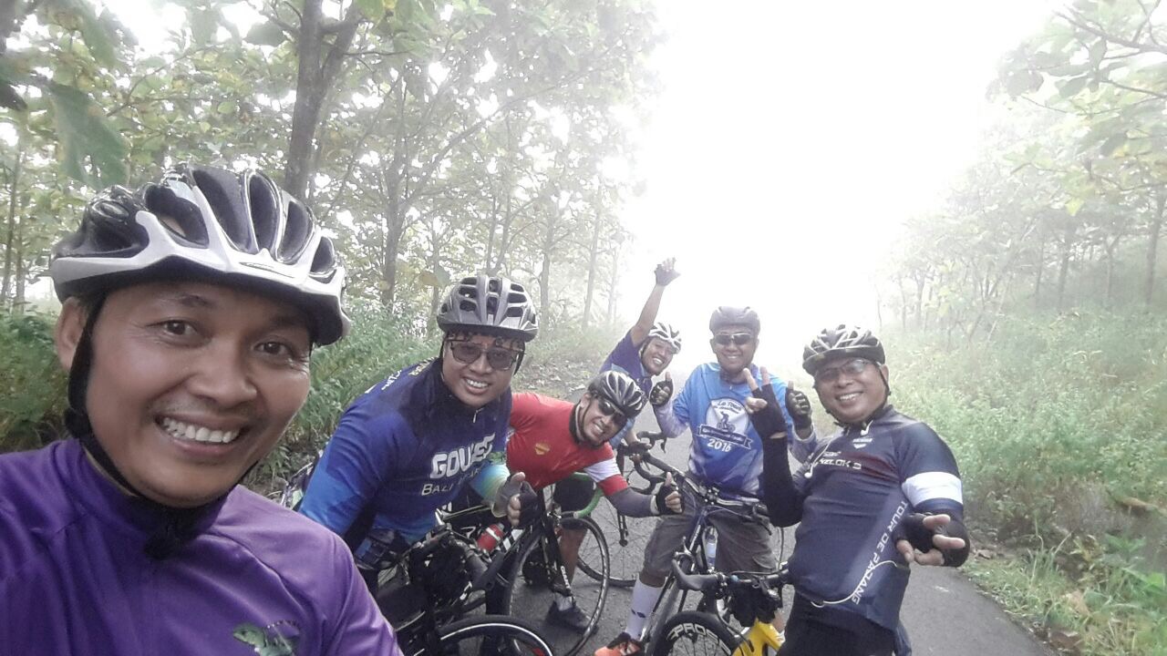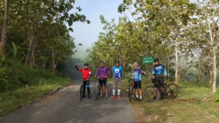 Dan pamandangan bukit yang berkabut nampak indah di depan, dan itulah bukit yang akan segera kami daki. Sekitar lima kilometer selepas SMP N 3 Imogiri, jalan terus nanjak dengan elevation gain sekitar 360m, dan berkelok-kelok dengan pemandangan bukit-bukit dan lembah yang hijau indah di kiri dan kanan jalan. Kecepatan perjalanan kami hanya sekitar 6 km per jam, thimak-thimik.