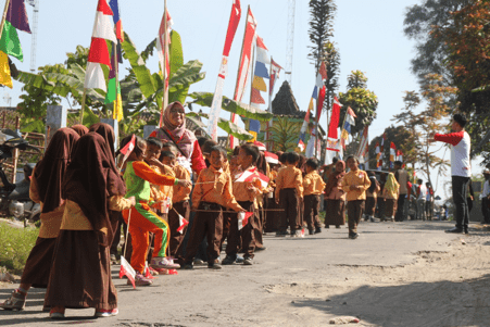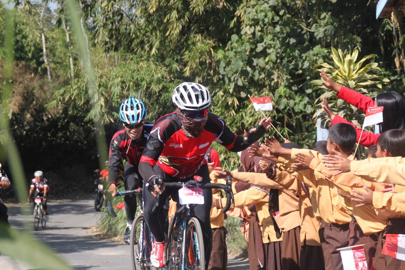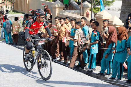 Satu hal yang membedakan Gowes Merdeka 2017 adalah adanya kegiatan Bakti Sosial yang dilaksanakan pada hari yang sama di delapan buah sekolah disepanjang jalur gowes kali ini yang dikoordinir oleh mbak Noer. Di delapan titik, di lokasi sekolah tersebut, para peserta gowes disambut meriah para siswa-siswi yang antusias mengibarkan bendera-bendera merah putih kecil dan menyemangati para peserta.