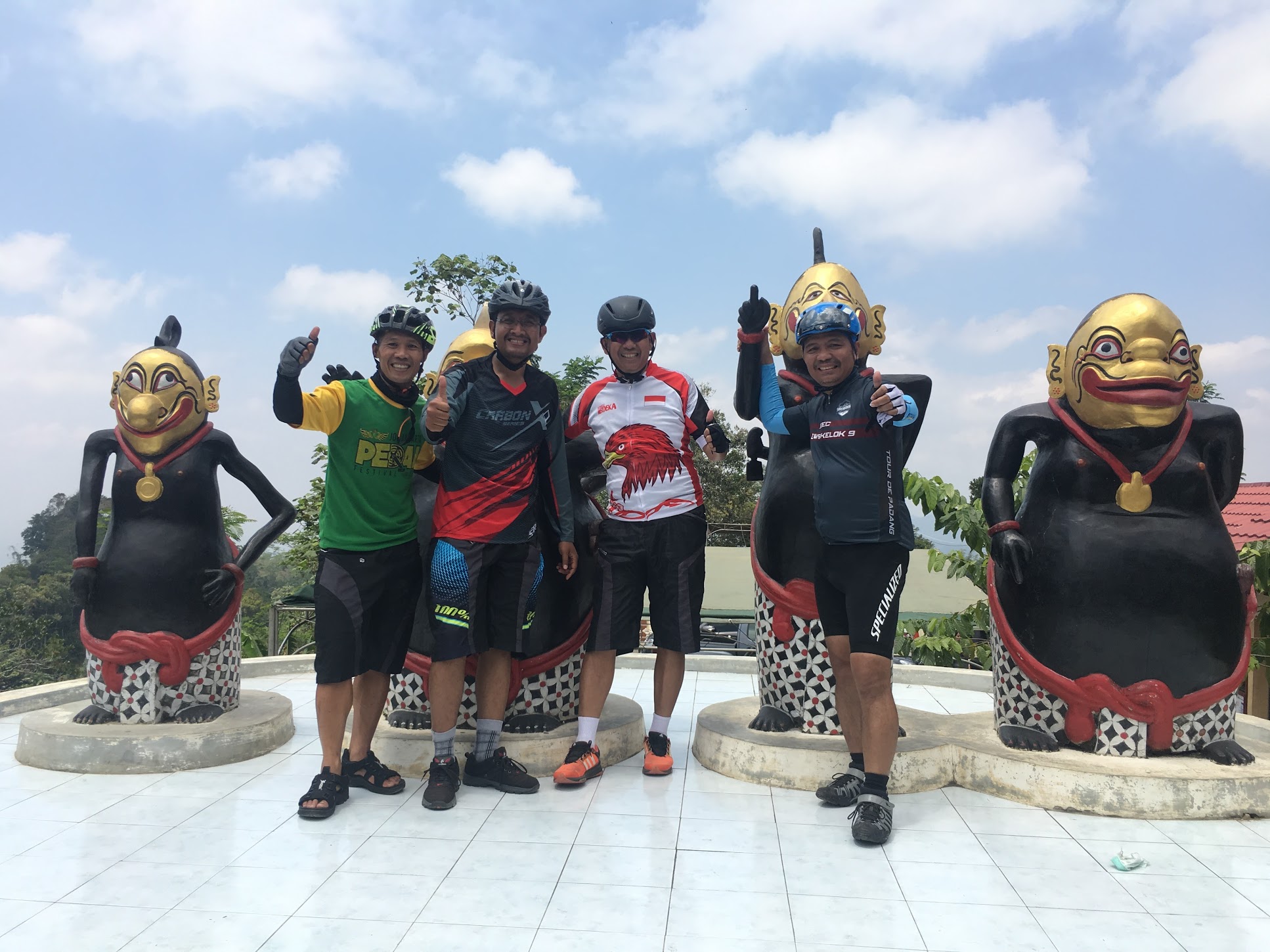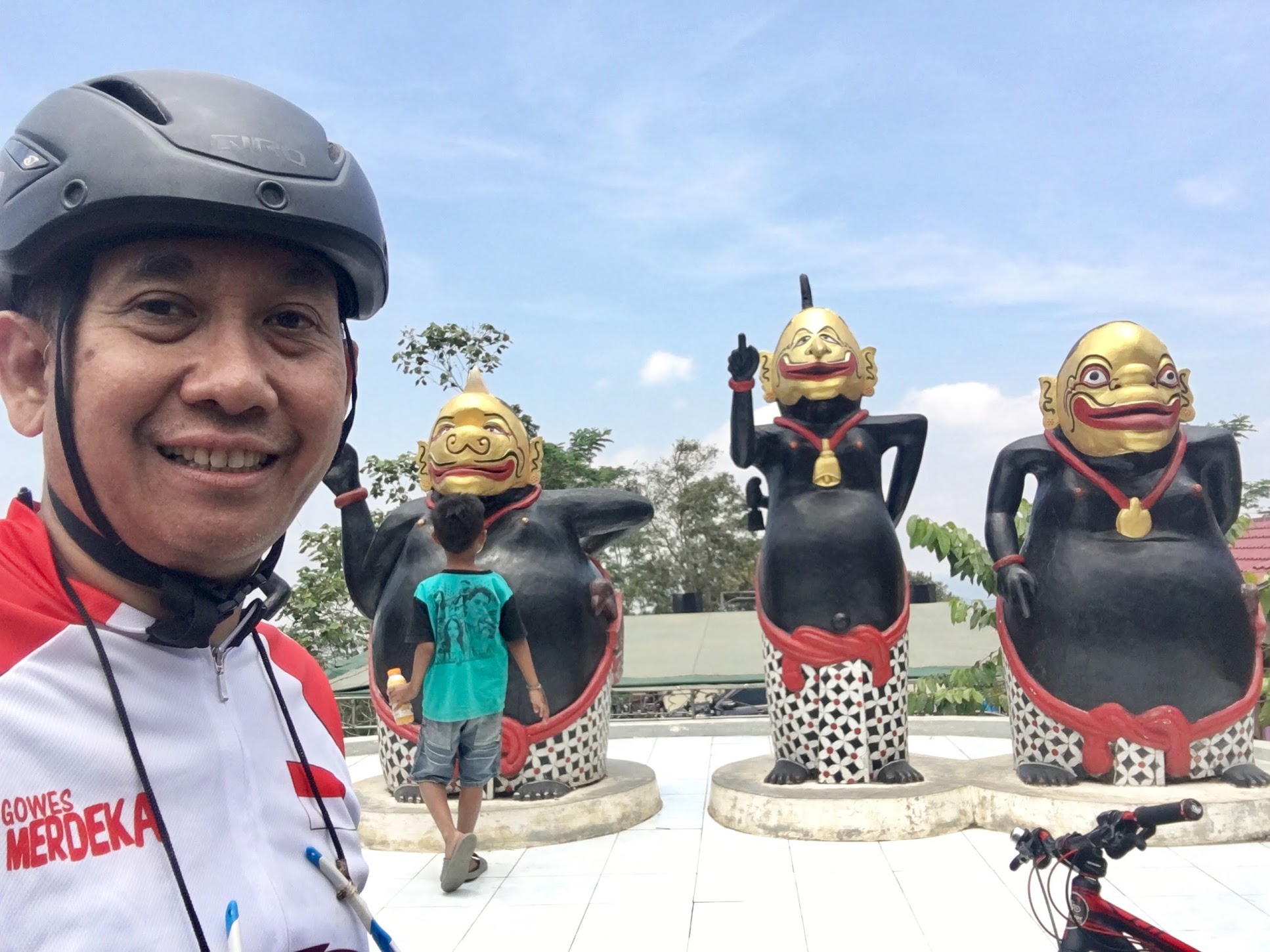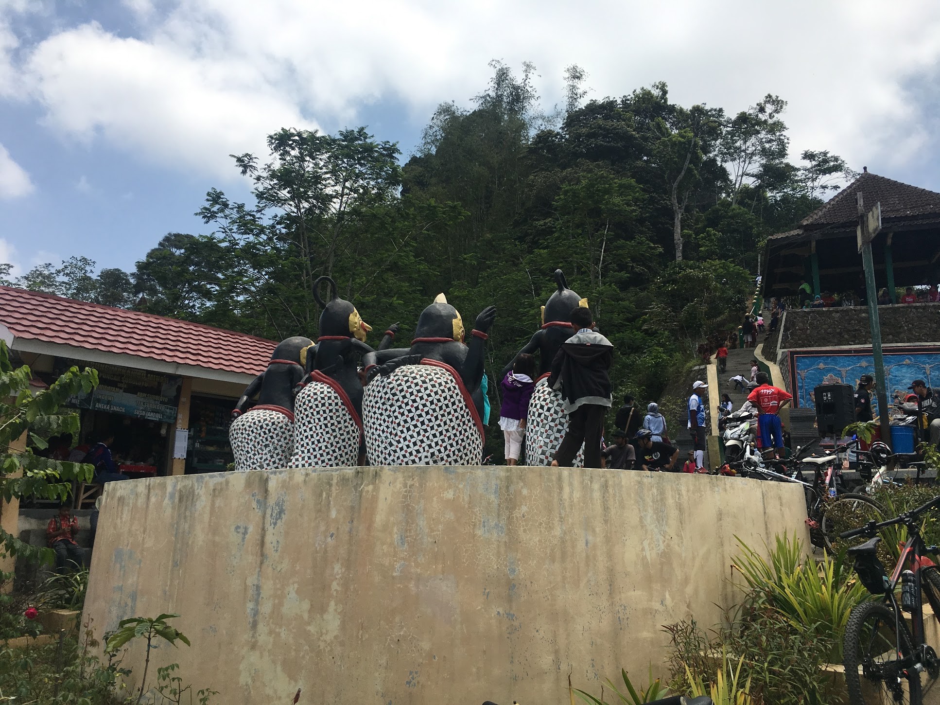 Setiba kami di Suroloyo, suasananya sangat ramai, dan pas pula arak-arakan, kirab acara adat sedang berlangsung. Kami langsung parkir sepeda di kedai Kopi Suroloyo Robusta, dan foto-foto di patung-patung yang bagi saya menjadi salah satu tujuan saya gowes ke Suroloyo ini, yaitu untuk berfoto di tempat patung-patung ini, bersama banyak teman dari berbagai daerah. Ada teman dari Wates, Yogya, Borobudur, Temanggung dan lain-lain, termasuk ketemu mas Ndaru dan beberapa friend di facebook yang belum pernah ketemu sebelumnya.