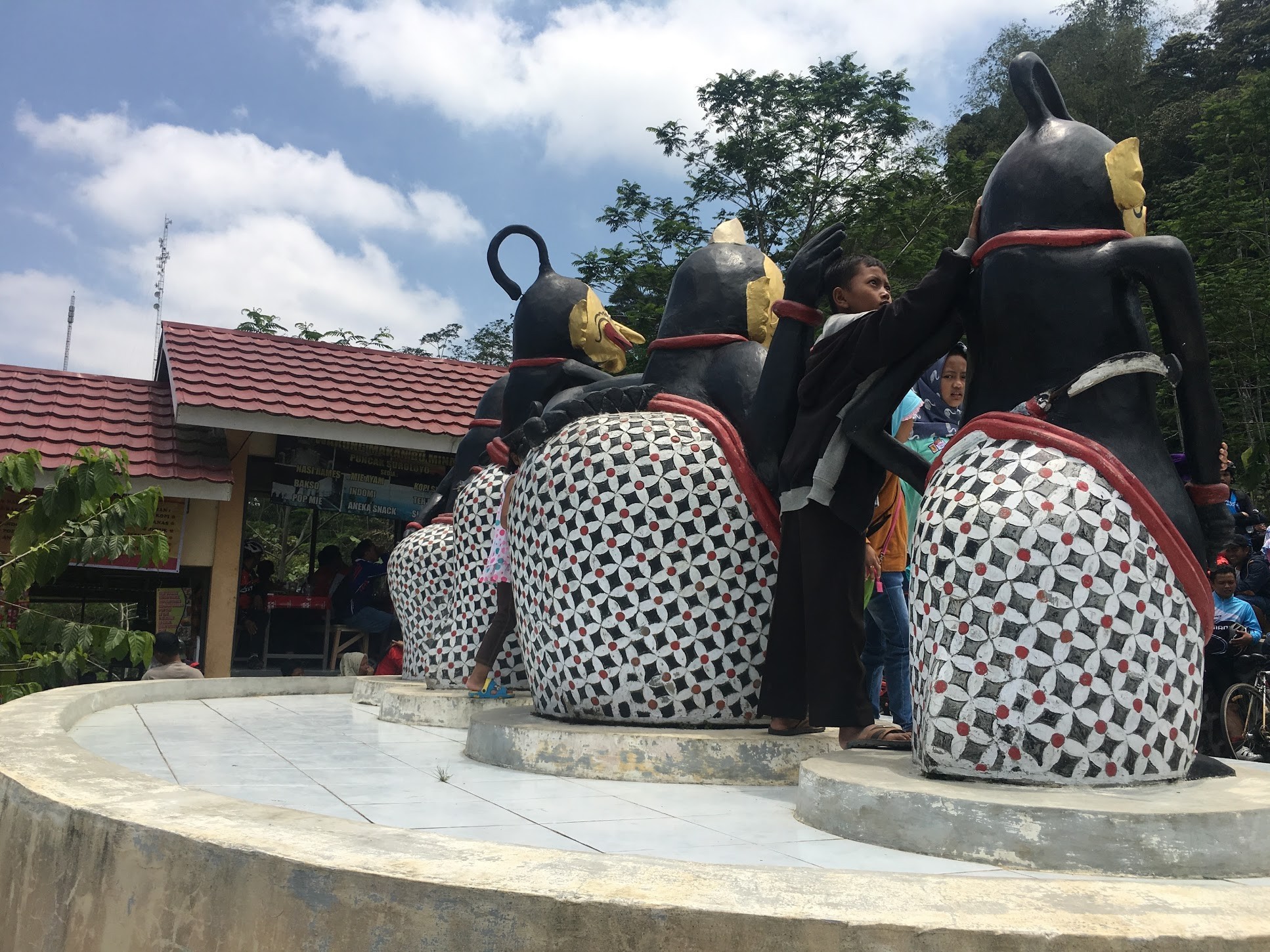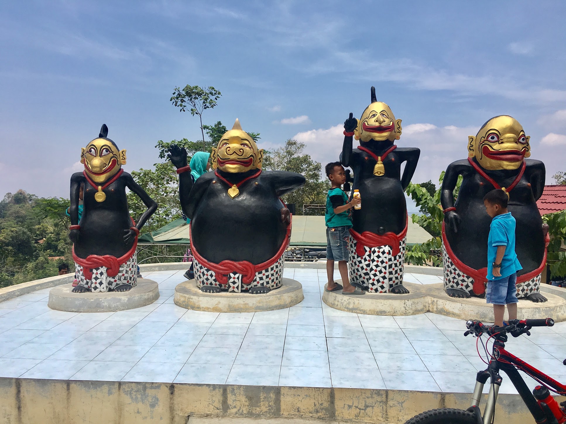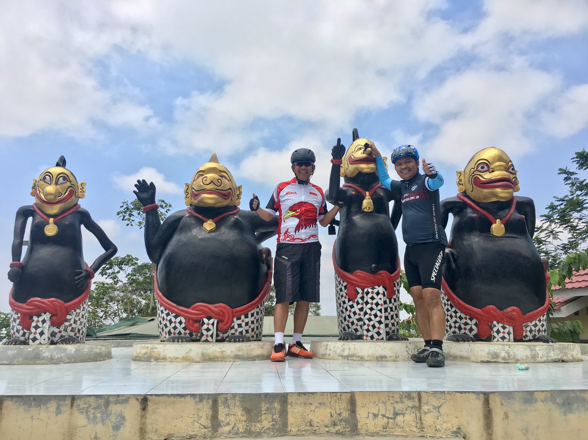 Setiba kami di Suroloyo, suasananya sangat ramai, dan pas pula arak-arakan, kirab acara adat sedang berlangsung. Kami langsung parkir sepeda di kedai Kopi Suroloyo Robusta, dan foto-foto di patung-patung yang bagi saya menjadi salah satu tujuan saya gowes ke Suroloyo ini, yaitu untuk berfoto di tempat patung-patung ini, bersama banyak teman dari berbagai daerah. Ada teman dari Wates, Yogya, Borobudur, Temanggung dan lain-lain, termasuk ketemu mas Ndaru dan beberapa friend di facebook yang belum pernah ketemu sebelumnya.