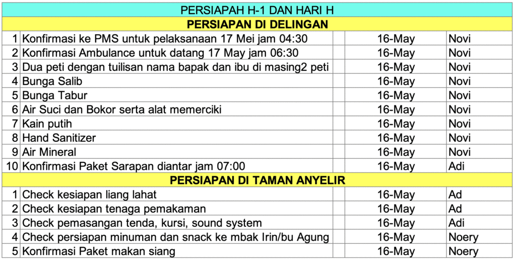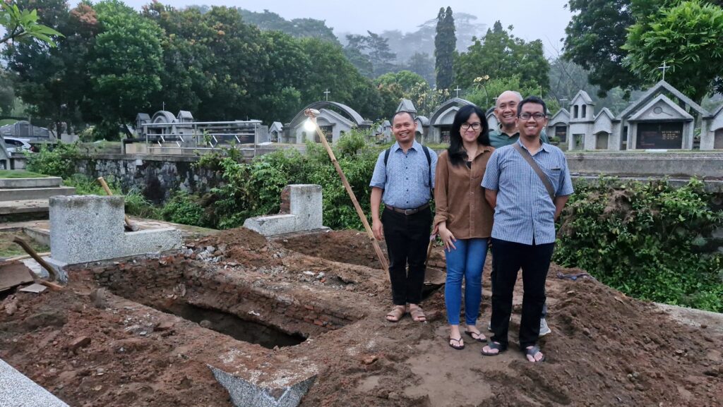 Saya diskusi dengan mas Pur, mas Sulis dan mas Mawan yang sudah berpengalaman melakukan pemindahan makam di Taman Anyelir juga. Dan untuk pelaksanaan pembuatan infrastruktur persiapan pemakaman saya diskusi dengan pak Diran yang melakukan pelaksanaan di lapangan. Pak Diran juga yang akan bertugas melakukan prosesi pemakaman bersama teman-temannya.