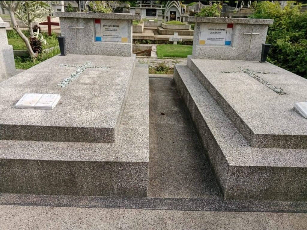 Papan nama kami ukur lebih besar dari nisan yang akan dibuat, dan akan dibuat baru dengan materi yang bagus dengan design yang sama persis dengan design yang ada. Begitu juga untuk hiasan Kitab Suci, kami memesan yang baru dengan tulisan ayat yang sama. Sedangkan salib akan tetap dipasang di nisan baru dengan diberi alas yang mempercantik. Dan vas bunga akan juga dipasang di makam baru.